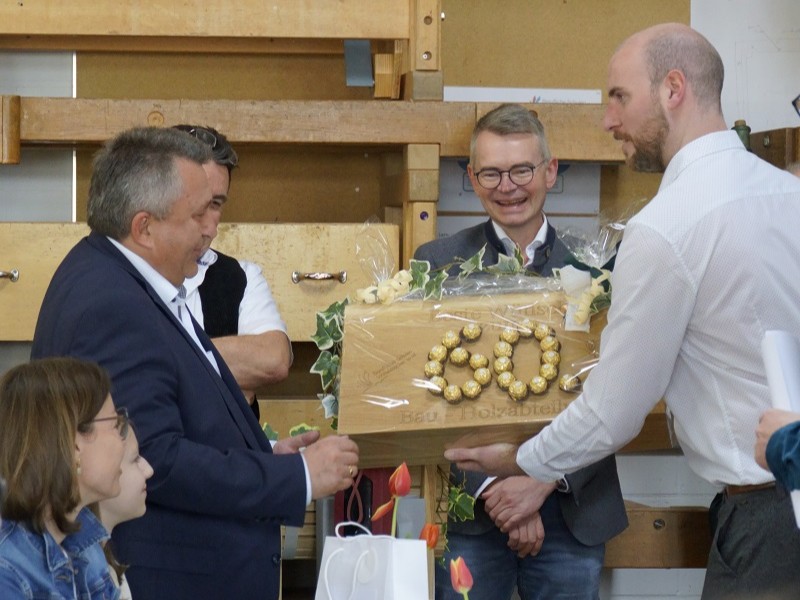 Ein großer Dank von Frau Nieberle ging an Herrn Hans Nagel, als neuer Fachbetreuer der Abteilung Holztechnik, für die Vorbereitung und Durchführung dieser Veranstaltung. Herr Nagel dankte seinem neu formierten Lehrerteam für die gute Zusammenarbeit und stellte dabei Herrn Hans Schmid, der als erfahrener Lehrer und Schreinermeister hervorragend ins Team passt, vor. Tobias Reischl wird im September die Fachlehrerausbildung in Ansbach beginnen und in Zukunft unsere angehenden Schreinerinnen und Schreiner unterrichten. Einen abschließenden Dank richtete Nagel an die Schulfamilie und den Hausmeister, Herrn Werner Winter, die mit großem organisatorischen Aufwand das Werkstattfest zu einem festen Bestandteil im Terminkalender der Beruflichen Schulen Wittelsbacher Land etabliert haben.